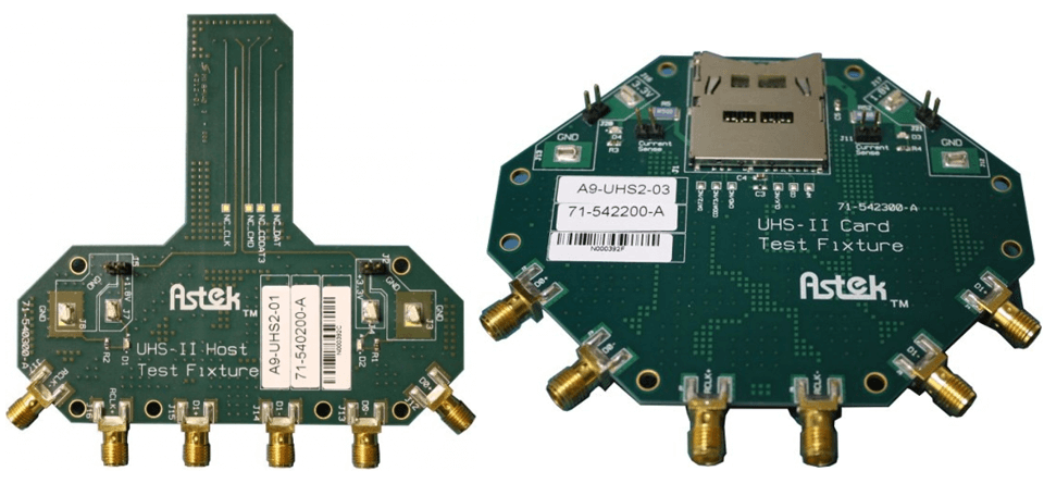 Astek Corporation提供了一系列的訊號量測治具,加快工程在不同介面上的訊號完整性量測。A9-UFS測試治具組包含了,UFS Host、UFS Device以及Device Power supply,可應用於產品訊號特性化量測、一致性測試和協定分析。此測試治具已經通過快閃記憶體協會的測試、審查和批准。Astek同時也提供SD4.0 UHS-II測試治具,讓設計與驗證工程師能夠驗證UHS-II主控與卡端產品是否符合SD協會針對UHS-II所定義的物理層測試規範。測試治具可支援到1.56Gb/s的相容性測試,在UHS-II產品與分析設備之間提供了SMA接頭與D0、D1、RCLK的差分信號進行連接,測試點可與傳統SD卡訊號連接,並且應用在UHS-II 1.8V以及3.3V的功率消耗量測,同時偵測UHS-II Host端上的1.8V和3.3V的供電能力。使用A9-UHS-II測試治具可以實現UHS-II系統的發射機與接收機的一致性測試以及回波損耗的量測。