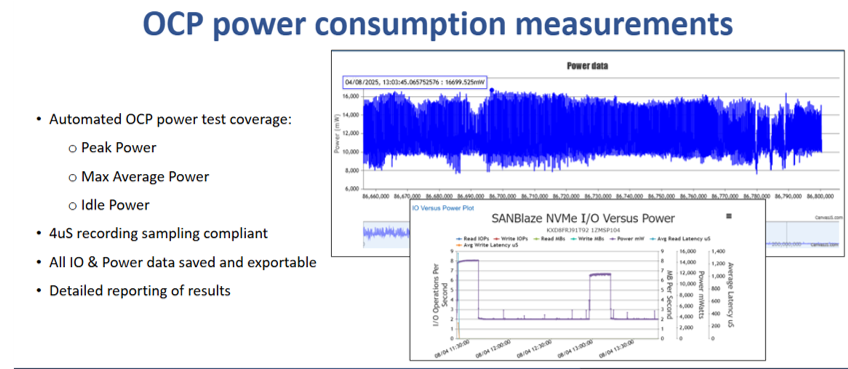 Open Compute Project(OCP)成立的目的,就是加速開放式硬體在超大規模數據中心環境中的創新與通用性,為了確保整體生態系統的穩定性與一致性,OCP 要求所有SSD都必須符合OCP NVMe Cloud SSD v2.0,或更新的Datacenter NVMe SSD v2.5 規範。為了協助供應商達到這些要求,SANBlaze將OCP的規範撰寫為測試腳本,這些測試不只驗證NVMe標準中要求的功能,還包含更高層級的OCP規範,例如:最低可靠度、熱管理、耐久度、管理功能以及Formfactor規格等多項條件。也就是說,一顆SSD想要通過OCP,需要達到比一般NVMe規範更嚴格、更多面向的品質要求,而SANBlaze就是用來執行並驗證這些額外測試的關鍵工具。