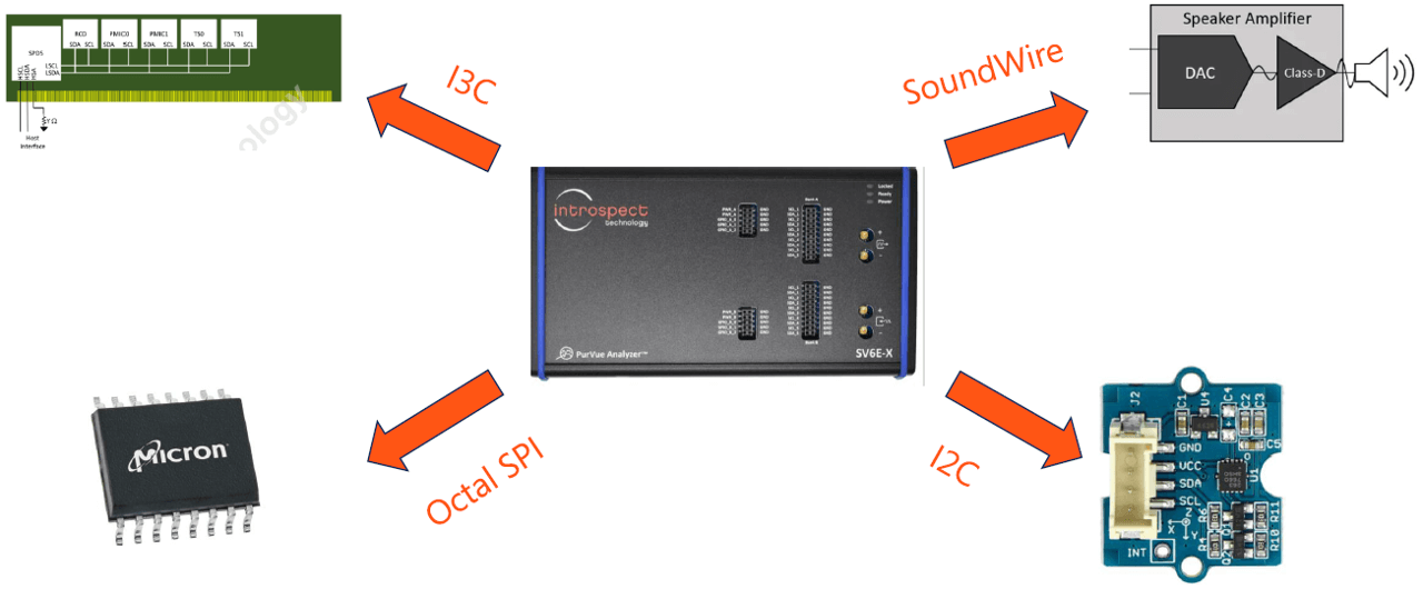 Introspect technology是MIPI Alliance與JEDEC的聯盟成員。Introspect SV6E-X是一款完整整合了中低頻數位介面開發與測試解決方案。他能支援支援多種常見的通訊協定,如 I2C、I3C、SPI、SoundWire和RFFE,能取代過去I/O測試中需要的繁瑣儀器。對於任一協定,SV6E-X等於同時提供三種功能於一台設備上:協定封包產生器、具高時間解析度的協定分析儀,以及支援完整符合性測試的即時示波器。這三項功能都能透過獲獎的 Pinetree 軟體同時、即時地存取與操作。設備僅須透過USB連接控制電腦,支援SDR、HDR模式且下向相容I2C,並可依照測試需求同時模擬為Master & Slave的角色。