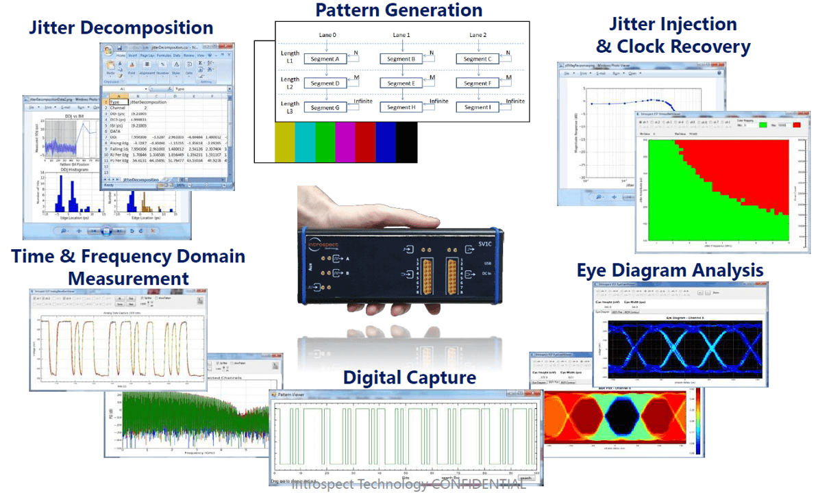 Introspect technology 開發一系列多通道、高速的測試方案,用於因應越來越複雜的電子元件與電路板在測試與驗證上的新需求。他可支援NRZ 28 Gbps或是PAM4 58Gbps(29 Gbaud)的速度,最高可提供16組獨立的Pattern Generator與16組獨立的Error detector,是一台體積小且高效益的誤碼測試儀(BERT),同時也是協定產生器與分析儀,能提供PCIe、Ethernet、USB、JESD204C等介面的完整協定層功能性測試與物理層測試能力。這款誤碼測試儀將多種工具整合於單一設備,包括feed-forward equalization,可程式化EQ以及Clock Recovery的錯誤偵測器、完整功能的封包產生器與分析儀。它能深入分析多通道的高色訊號中的串擾效應(Cross-talk)與通道間差異,提供前所未有的測試洞察能力。
