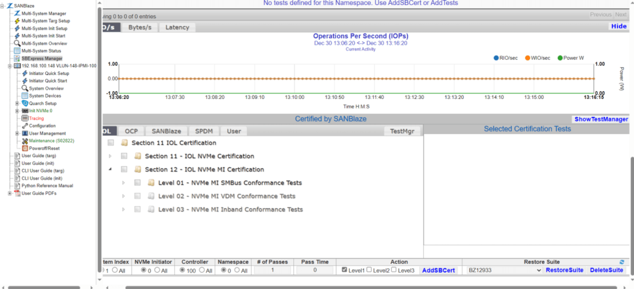 NVMe conformance test是在檢查SSD裡面的控制器和韌體,是否完全符合 NVMe的標準規範,確保SSD在各種主機與環境中都能穩定、安全地溝通。SANBlaze的SBExpress-RM6就是針對這類測試設計的設備。用這台測試系統,你可以模擬真實資料中心的讀寫行為,讓SSD像在真實使用中一樣被「推到極限」,但同時還能量測功率、電壓和電流,了解它在高強度下的表現。