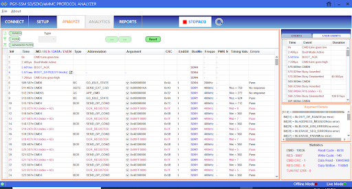 PGY-SSM-eMMC是一款可以支援eMMC 5.x的協定分析儀,用來擷取SoC與eMMC裝置之間通訊協定的多功能分析設備。eMMC隨著規格演進到版本 4.0/5.1甚至到5.x,支援高達200 MHz DDR(HS400)模式,整個通訊流程既複雜、對時間又敏感。若只用示波器,或只靠軟體log,往往找不到潛藏的時序錯誤、CRC問題,尤其是那些偶發、在特定環境下才出現的問題。設備採用創新的主動式探棒,對於待測環境的電氣負載非常小,因此能在不影響待測平台正常運作的情況下擷取協定資料。PGY-SSM的另一大特色是,他可以透過USB 3.0或GbE介面,將擷取到的協定資料即時並持續傳送到到控制電腦,讓工程師可以立刻了解匯流排上發生的情況。